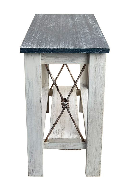 Navy All Wood Side Table with Slat Shelf and Knotted Rope Accent