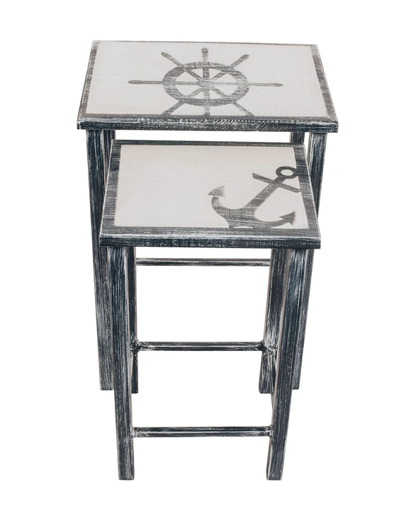 Navy/Cottage Nesting Iron/Wood Drink Tables with Captains Wheel and Anchor Accent