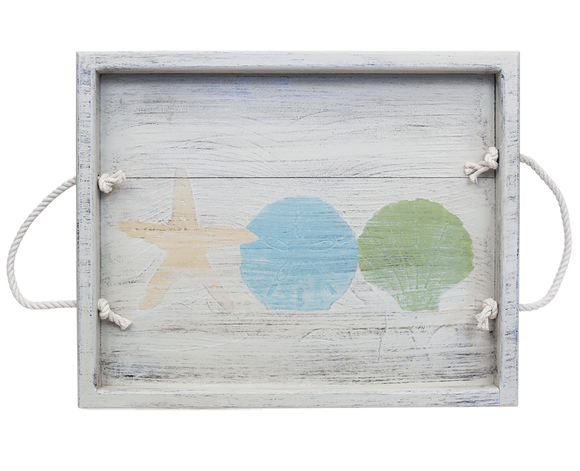 18"x20" Wood Tray with etched Sailboat Base and White Rope Handles- Nautical