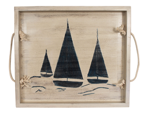 18x20" Wooden Serving Tray with Etched Sailboat Base and White Rope Handles