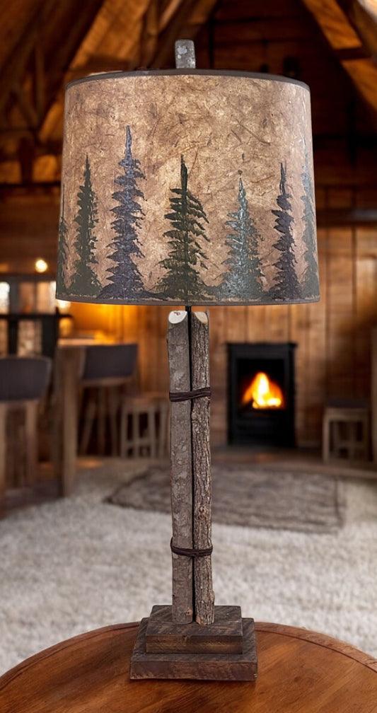 Twig and Leather Table Lamp w/ Rough Sawn Base and Pine Tree Shade