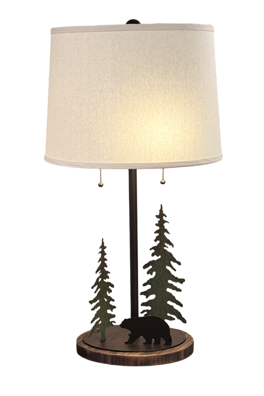 Rugged Pine Iron Bear and Tree Lamp w/ Rough Sawn Base and 2 Bulb Socket