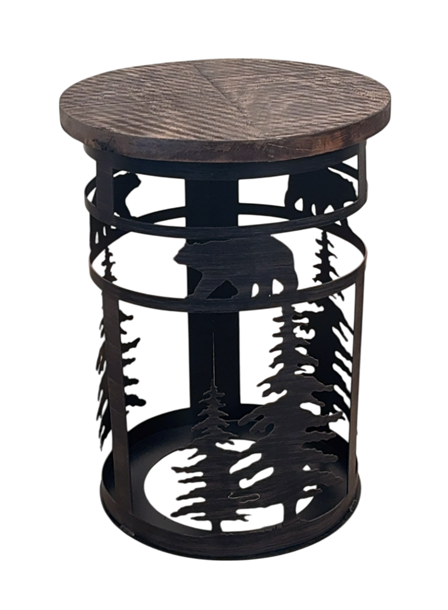 KODIAK IRON CYLINDER END TABLE WITH BEAR AND TREE ACCENT AND ROUGH SAWN TOP